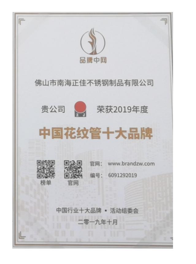中國花紋管十大品牌證書