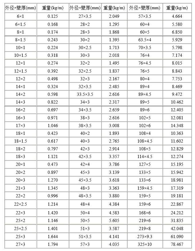 表供大家參考。正佳不銹鋼是一家集生產(chǎn)、銷售、加工、服務(wù)為一體的大型企業(yè),每一支不銹鋼管都是嚴格按照制作流程進行加工制造,每一支管子的重量都會控制在國標的范圍之內(nèi)。我們的管子是可以根據(jù)客戶的要求過磅銷售的,所以在管子的重量上您可以放心,歡迎咨詢!